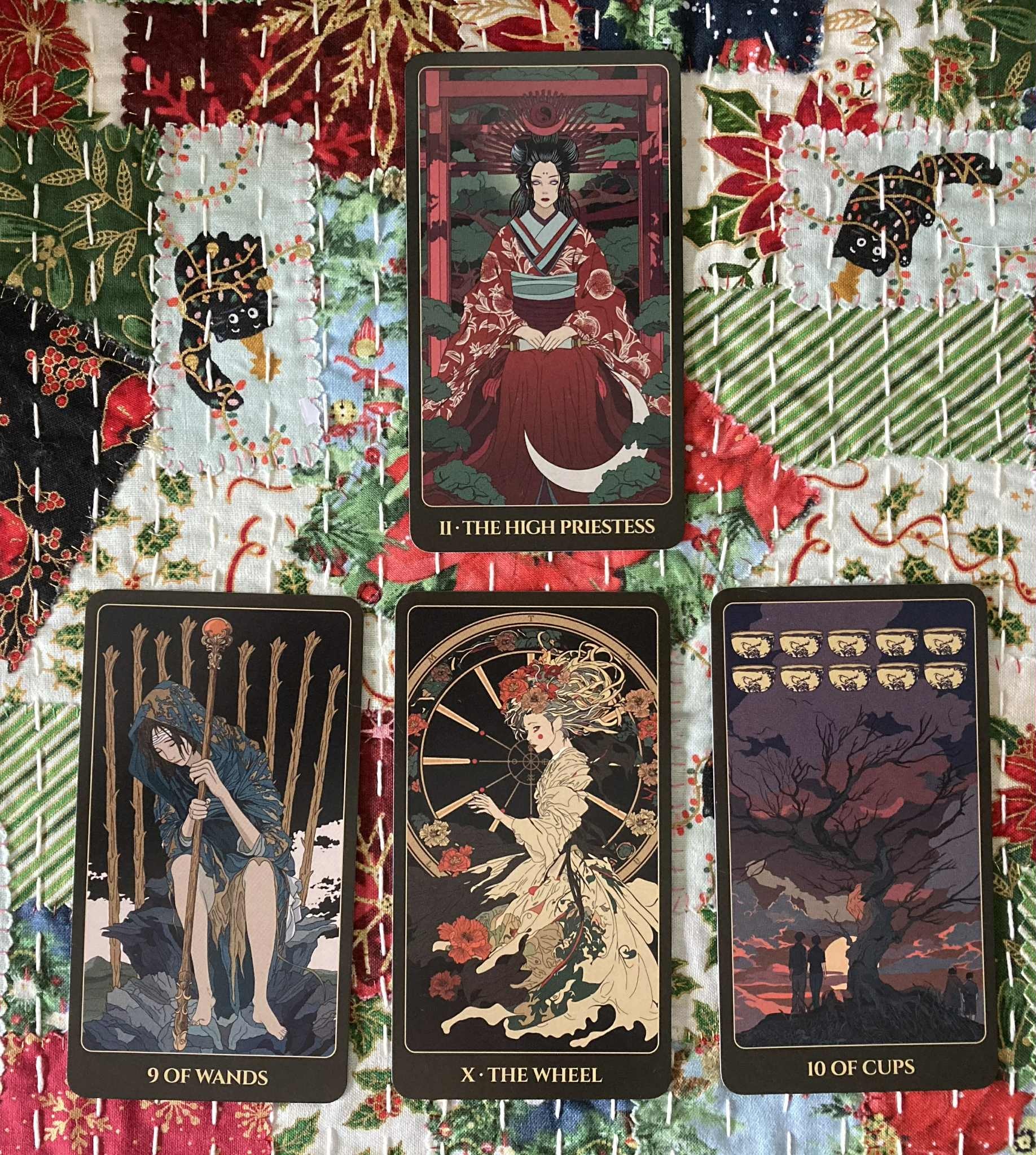 The book gives the reader a few spreads to try, one of which is the Floating World Spread made specifically for this deck. I gave it a try by shuffling the deck as instructed, then drew cards until I got a Major Arcana card (The High Priestess), then shuffled the remaining cards and drew three.