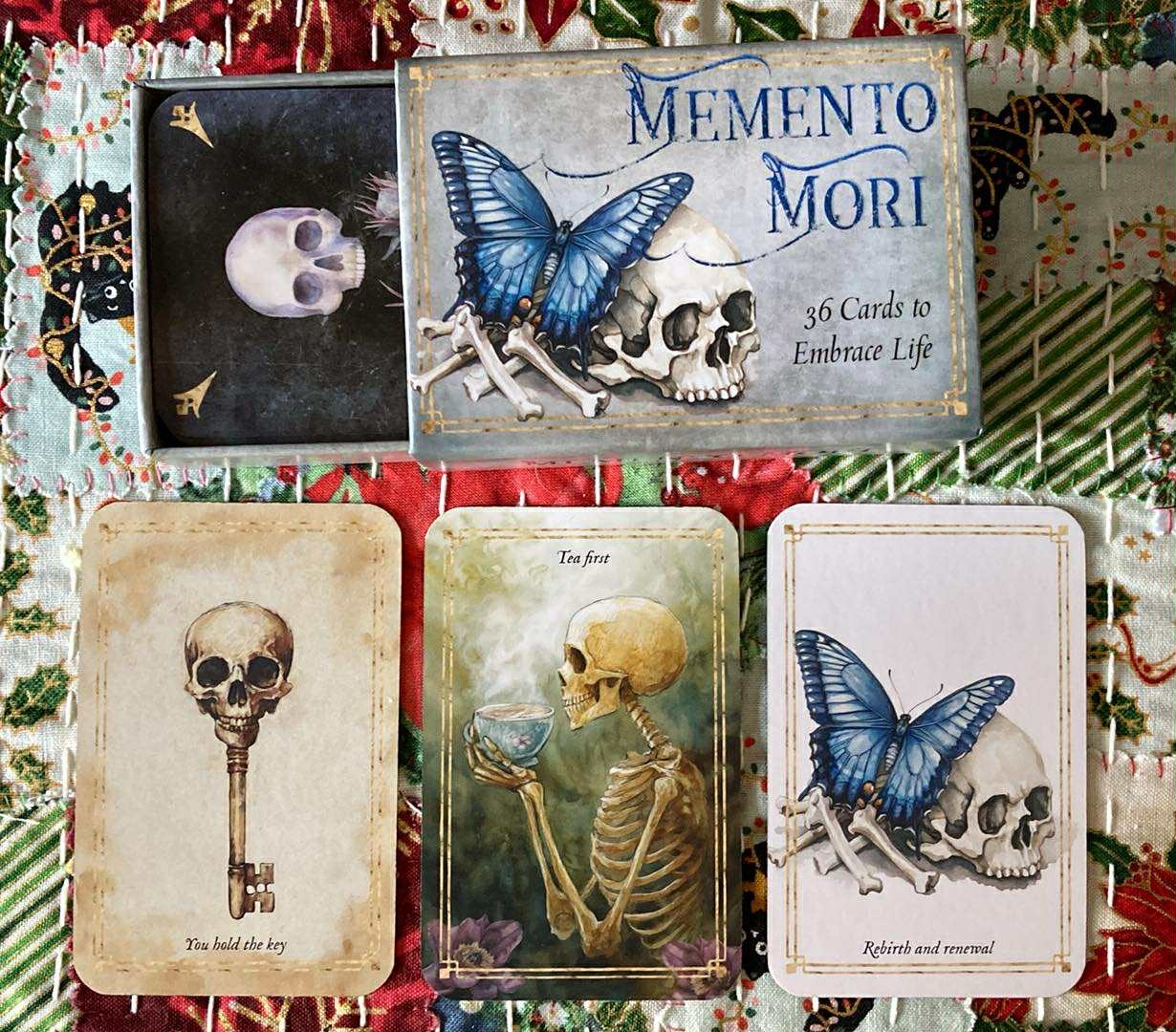 I have also begun drawing one card from this deck along with my daily three-card tarot deck draw, and this really does enhance the tarot reading: whatever I have asked of the tarot cards, the Memento Mori deck softens and expands on those cards with something I might stop and contemplate alongside them.
