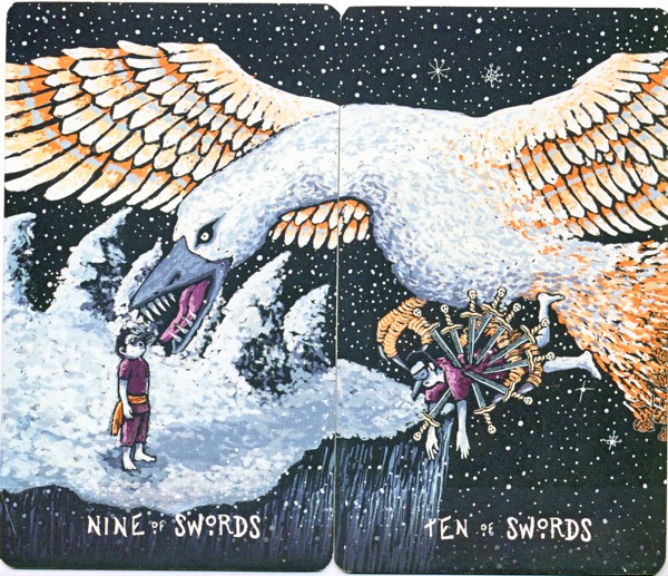 The pip cards adhere fairly closely to the RWS cannon, with some unexpected flights of fancy. The Swords panorama features snowy scenes and a huge white goose with big sharp teeth. In the Nine of Swords, the Great Goose is about to bite or eat the guy standing on the snow, while in the contiguous image for the Ten of Swords, the Goose's claws grip a masked character pierced by ten swords, with body a wing and the tail visible in the image.