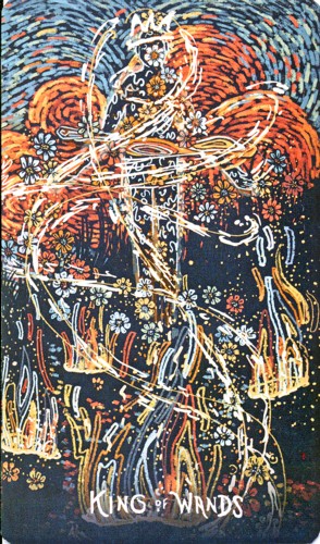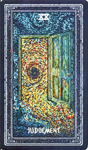 The art is the most exciting feature of the Prisma Visions Tarot. The style is impressionistic and reminiscent of Vincent Van Gogh. All of the card images are built up from a base of dark blue, an effect that serves to unify the imagery throughout the deck.
