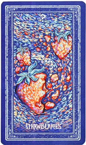 The Major Arcana cards have borders. The card names have not been changed, but the imagery is more idiosyncratic. For instance, the Chariot card is a depiction of an automobile driving through the rain with head lights on and a white dove fluttering over the hood. The Sun card shows a bouquet melting into color puddles at the bottom of the image. The Fool is a pelican perched on a dock post near a shore. A life-preserver is looped over the post. There is also a 79th card called “Strawberries.” The reader can keep or omit this card when shuffling; it's a goofy but sweet wild card. It can take a while to puzzle out the symbolism contained in some of the trump images. This makes it even more interesting to read with the deck, because the imagery is not always straightforward. The impressionism offers impressions, so there can be a lot more contained in a card than first meets the eye.