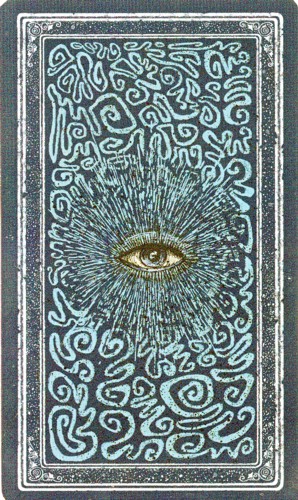 “The Visions Guide Instructional Booklet” by Katherine Tombs is well-written and beautifully formatted. Each card has a one-page description with card meanings. A few simple tarot spreads are offered. The dark blue color theme continues to the booklet's cover and the custom box, which is printed inside and out. The card backs feature an open eye surrounded by a labyrinth and the same border used on the trump cards. The cards have silvered edges, quite an elegant touch.