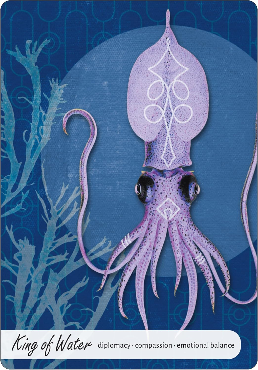 Most cards feature an animal, while some feature a flower or plant. Creatures occupy the foreground. Circles float behind the creatures as a unifying visual element, along with plants or flowers over a background color or pattern. Animals are drawn with white tribal-style markings. Sometimes these markings are minimal, but for example, the King of Fire/Scarab Beetle features an elaborate design. This design feature conveys a First Nations feel to the deck’s imagery, although the markings aren’t necessarily tribal in origin. The edges of the cards are metallic green, yet another distinctive feature of this deck.