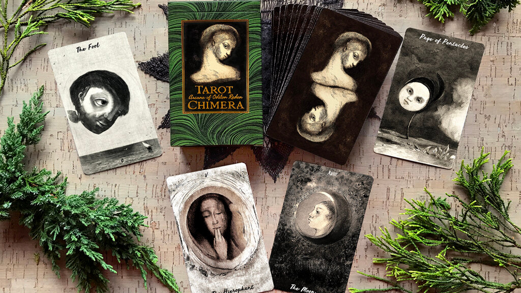 Inspired by the Chimera archetype and curated by Nitasia Roland, the author blends tarot with the art of Odilon Redon to create a truly unique Tarot Deck. Drawing from the Symbolism Movement, Redon's work is filled with black and white compositions filled with occult and symbolic imagery that would look comfortable in an episode of The Night Gallery.